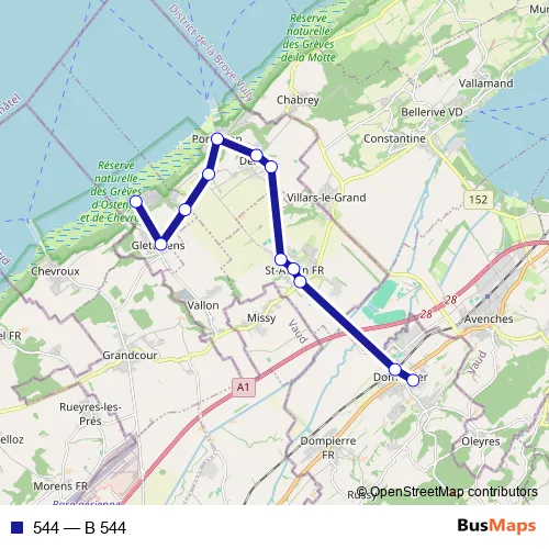 The first stop of the 544 bus route is Domdidier, Co and the last stop is Gletterens, lac. 544 (B 544) is operational during an Werktagen.