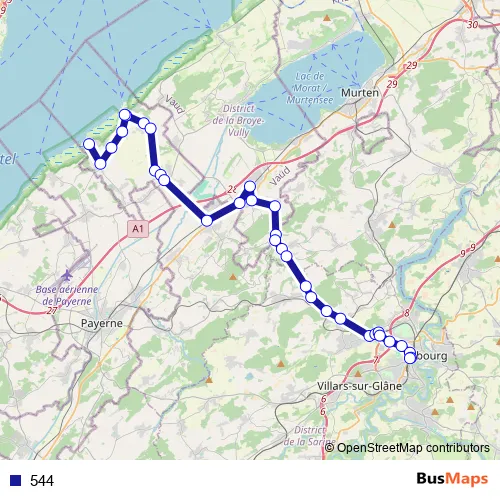 The first stop of the 544 bus route is Gletterens, lac and the last stop is Fribourg/Freiburg, gare rout.. 544 is operational during täglich.