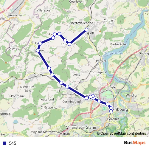 The first stop of the 545 bus route is Fribourg/Freiburg, gare rout. and the last stop is Courtepin, gare. 545 is operational during täglich.
