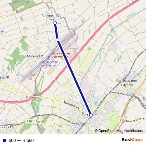 The first stop of the 560 bus route is Payerne, gare and the last stop is Rueyres-les-Prés, école. 560 (B 560) is operational during an Werktagen.