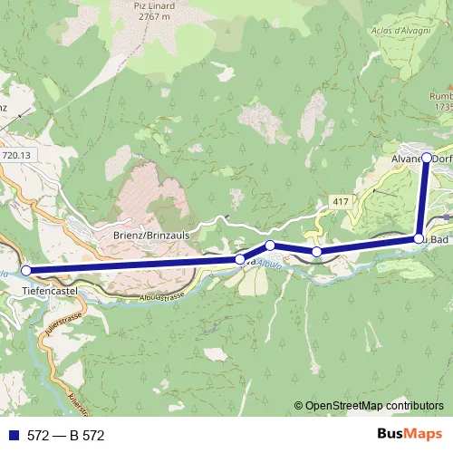 The first stop of the 572 bus route is Tiefencastel, staziun and the last stop is Alvaneu Dorf, Dorfplatz. 572 (B 572) is operational during täglich.