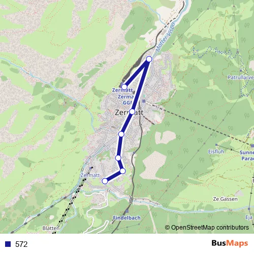 The first stop of the 572 bus route is Zermatt, Bahnhof and the last stop is Zermatt, Kapelle Winkelmatten. 572 is operational during täglich.