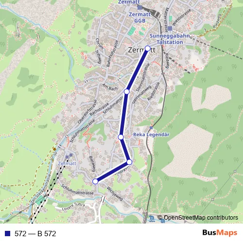 The first stop of the 572 bus route is Zermatt, Vispa and the last stop is Zermatt, Kapelle Winkelmatten. 572 (B 572) is operational during täglich.