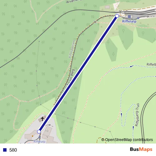 The first stop of the 580 tram route is Riffelalp, Station and the last stop is Riffelalp, Hotel. 580 is operational during täglich.