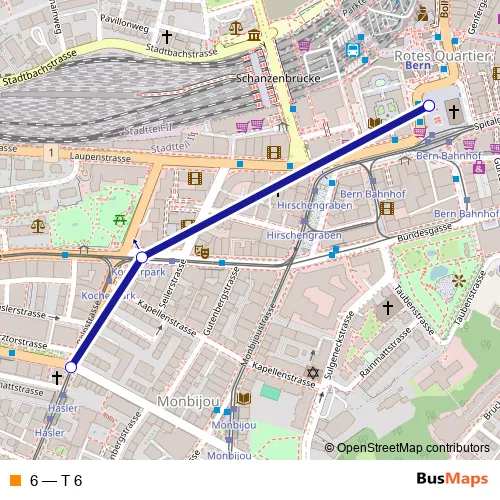 The first stop of the 6 tram route is Bern, Hasler and the last stop is Bern, Bahnhof. 6 (T 6) is operational during täglich.