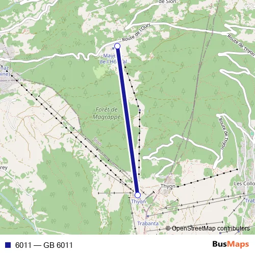 The first stop of the 6011 cable-car route is Mayens-de-l'Hôpital and the last stop is Thyon. 6011 (GB 6011) is operational during täglich.