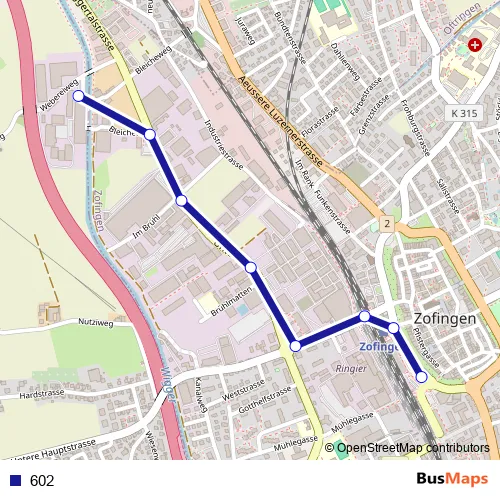 The first stop of the 602 bus route is Zofingen, Industrie Brühl and the last stop is Zofingen, Bahnhof. 602 is operational during an Werktagen.