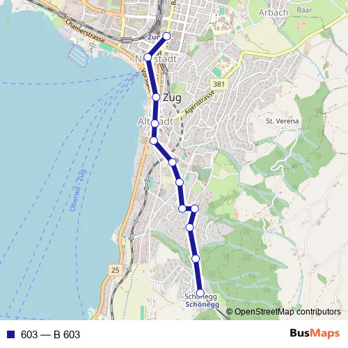 The first stop of the 603 bus route is Zug, Metalli/Bahnhof and the last stop is Zug, Schönegg. 603 (B 603) is operational during täglich.