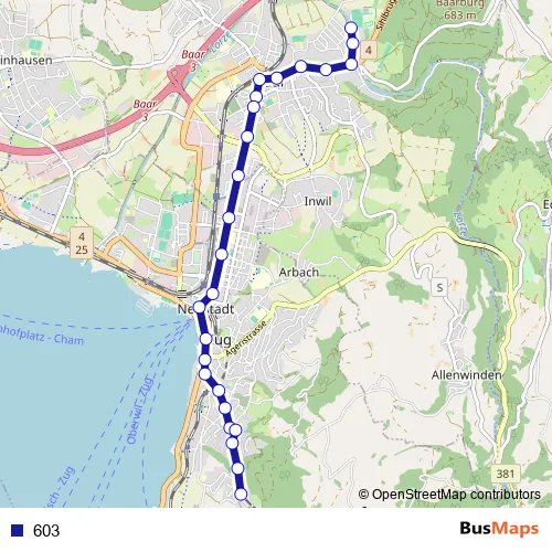 The first stop of the 603 bus route is Baar, Lättich and the last stop is Zug, Schönegg. 603 is operational during täglich.