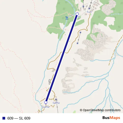 The first stop of the 609 cable-car route is Furt (Talstation) and the last stop is Gaffia (Bergstation). 609 (SL 609) is operational during täglich.
