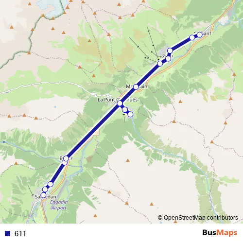 The first stop of the 611 bus route is Samedan, Bahnhof and the last stop is S-chanf, Chesa cumünela. 611 is operational during täglich.