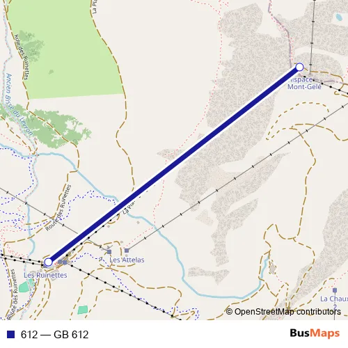 The first stop of the 612 cable-car route is Les Attelas and the last stop is Croix-des-Ruinettes. 612 (GB 612) is operational during täglich.