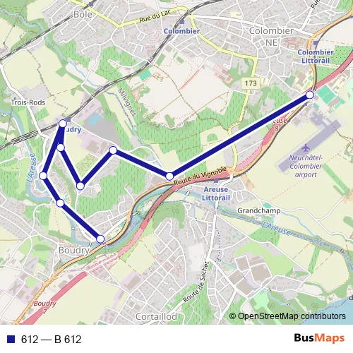 The first stop of the 612 bus route is Colombier NE, Cescole and the last stop is Boudry Littorail, gare. 612 (B 612) is operational during an Werktagen.