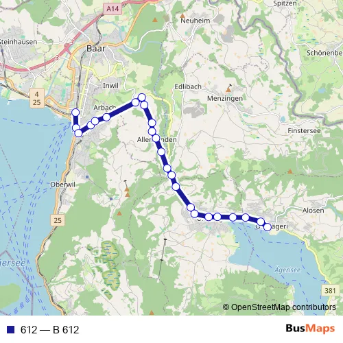 The first stop of the 612 bus route is Zug, Bahnhofplatz and the last stop is Oberägeri, Station. 612 (B 612) is operational during an Werktagen.