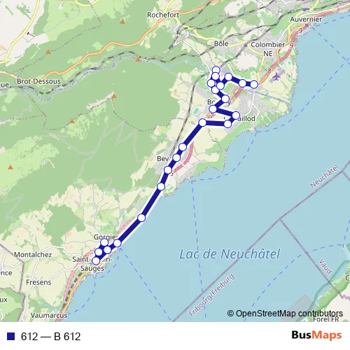 The first stop of the 612 bus route is Gorgier-St-Aubin, gare and the last stop is Areuse Littorail, gare. 612 (B 612) is operational during täglich.