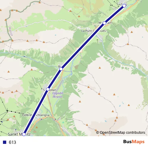 The first stop of the 613 bus route is Zuoz, staziun and the last stop is St. Moritz, Bahnhof. 613 is operational during täglich.
