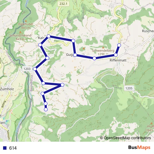 The first stop of the 614 bus route is Riffenmatt, Schwendi and the last stop is Guggisberg, Riedacker. 614 is operational during an Werktagen.
