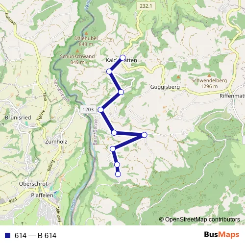 The first stop of the 614 bus route is Guggisberg, Riedacker and the last stop is Guggisberg, Kalchstätten. 614 (B 614) is operational during an Werktagen.