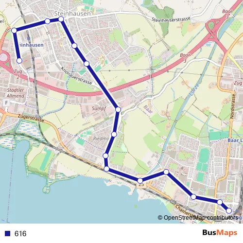 The first stop of the 616 bus route is Steinhausen, Zugerland Ekz and the last stop is Zug, Dammstrasse/Bahnhof. 616 is operational during an Werktagen.