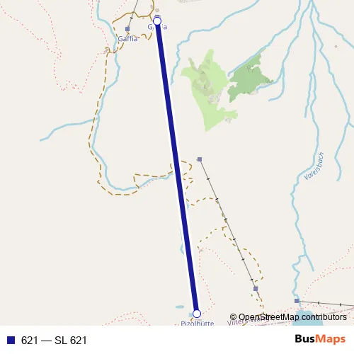The first stop of the 621 cable-car route is Gaffia (Talstation) and the last stop is Pizolhütte. 621 (SL 621) is operational during täglich.