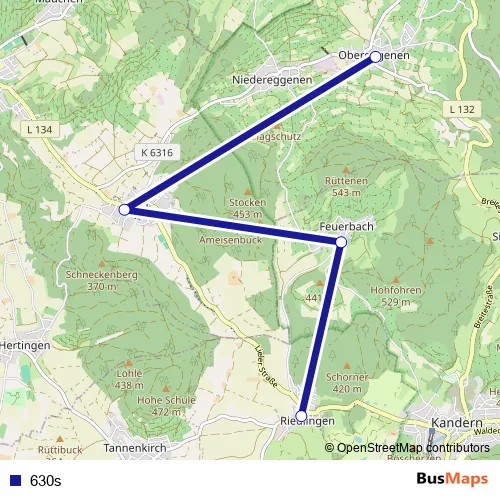 The first stop of the 630s bus route is Obereggenen, Rathaus and the last stop is Riedlingen, Milchhaus. 630s is operational during an Werktagen.