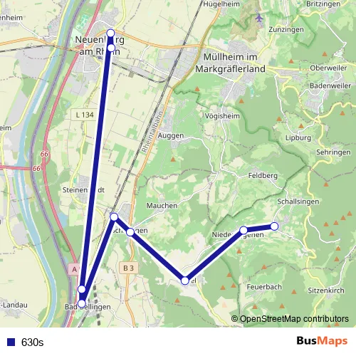 The first stop of the 630s bus route is Neuenburg (D), Friedhofstr. and the last stop is Obereggenen, Rathaus. 630s is operational during an Werktagen.