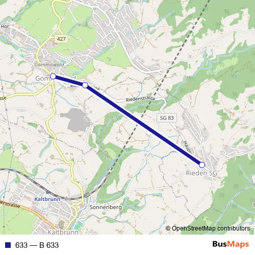 The first stop of the 633 bus route is Gommiswald, Dorf and the last stop is Rieden SG, Dorf. 633 (B 633) is operational during an Werktagen.
