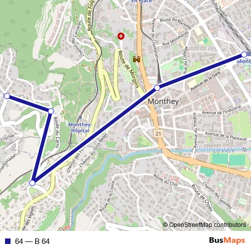 See why over 2 million users trust and consider busmaps.com as the best public transport website. busmaps gives you Monthey Buses suggested routes, real-time bus tracker, line route maps in Monthey, and helps to find the closest 64 bus stops near you. No internet available? Download an offline PDF map and bus schedule for the 64 bus to take on your trip.