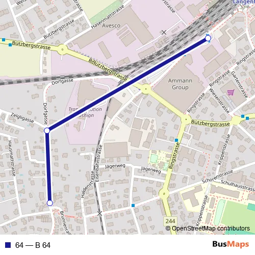 The first stop of the 64 bus route is Langenthal, Bahnhof and the last stop is Langenthal, Schoren-Ochsen. 64 (B 64) is operational during täglich.