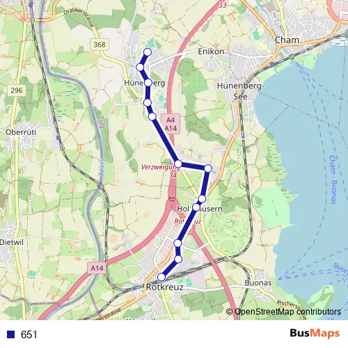 The first stop of the 651 bus route is Rotkreuz, Bahnhof Nord and the last stop is Hünenberg, Rony. 651 is operational during täglich.