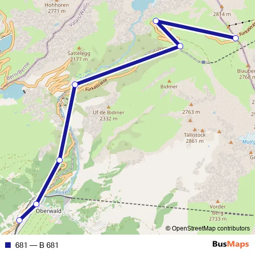 The first stop of the 681 bus route is Furka Passhöhe and the last stop is Oberwald, Bahnhof. 681 (B 681) is operational during täglich.