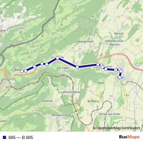 The first stop of the 685 bus route is Ballaigues, poste and the last stop is Orbe, poste. 685 (B 685) is operational during an Werktagen.