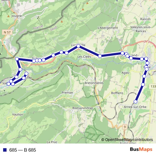 The first stop of the 685 bus route is Vallorbe, poste and the last stop is Arnex, gare. 685 (B 685) is operational during an Werktagen.