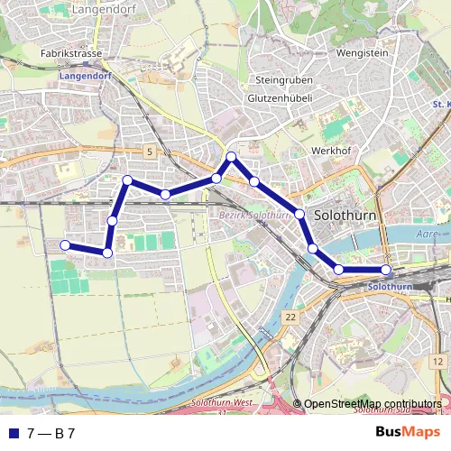 The first stop of the 7 bus route is Solothurn, Hauptbahnhof and the last stop is Solothurn, Brühl. 7 (B 7) is operational during an Werktagen.