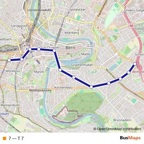 The first stop of the 7 tram route is Bern, Kocherpark and the last stop is Bern, Ostring. 7 (T 7) is operational during täglich.