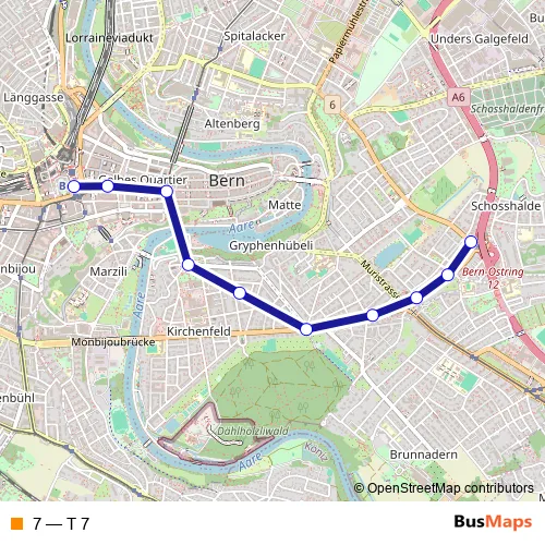 The first stop of the 7 tram route is Bern, Ostring and the last stop is Bern, Bahnhof. 7 (T 7) is operational during an Werktagen.
