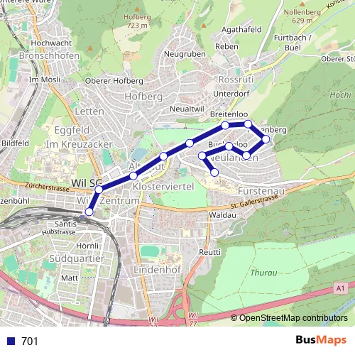 The first stop of the 701 bus route is Wil SG, Bahnhof and the last stop is Wil SG, Spital. 701 is operational during täglich.