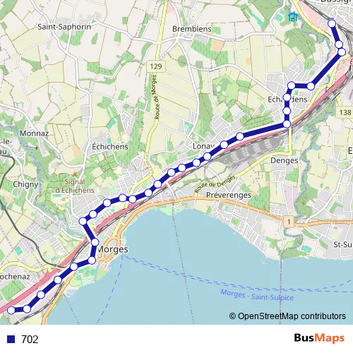 The first stop of the 702 bus route is Bussigny, gare sud and the last stop is Tolochenaz, Les Saux. 702 is operational during täglich.