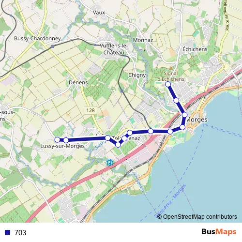 The first stop of the 703 bus route is Lussy-sur-Morges, village and the last stop is Morges, Marcelin. 703 is operational during täglich.