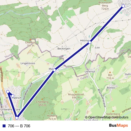 The first stop of the 706 bus route is Braunau, Dorf and the last stop is Bronschhofen, Himmelrich. 706 (B 706) is operational during an Werktagen.