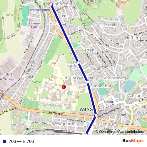 The first stop of the 706 bus route is Bronschhofen, Gemeindehaus and the last stop is Wil SG, Bahnhof. 706 (B 706) is operational during täglich.