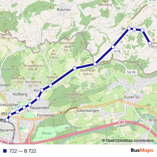 The first stop of the 722 bus route is Hosenruck, Dorf and the last stop is Wil SG, Bahnhof. 722 (B 722) is operational during täglich.