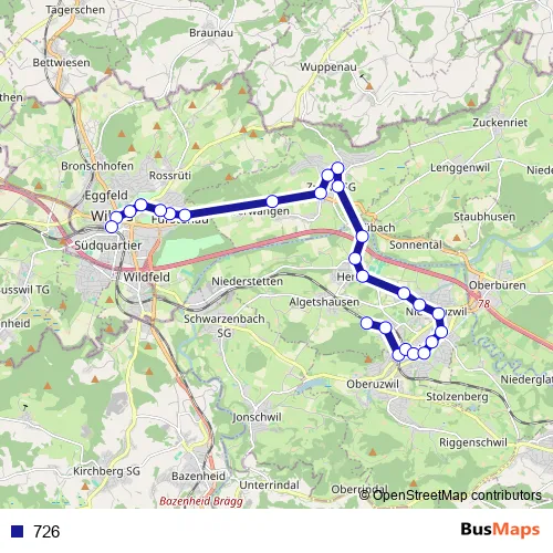 The first stop of the 726 bus route is Uzwil, Waldhof and the last stop is Wil SG, Bahnhof. 726 is operational during täglich.