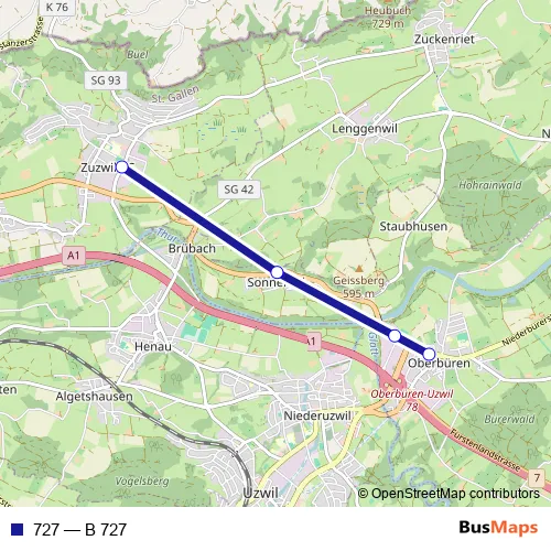 The first stop of the 727 bus route is Oberbüren, Zentrum and the last stop is Zuzwil SG, Industrie. 727 (B 727) is operational during täglich.