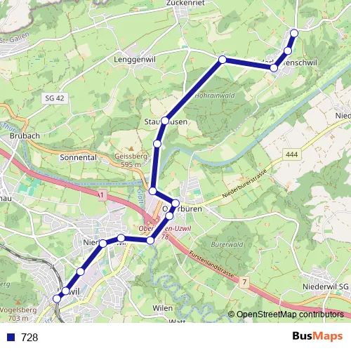 The first stop of the 728 bus route is Uzwil, Bahnhof and the last stop is Niederhelfenschwil, Neudorf. 728 is operational during täglich.