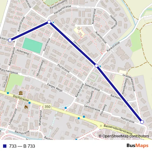 The first stop of the 733 bus route is Kloten, Graswinkel and the last stop is Kloten, Ackerstrasse. 733 (B 733) is operational during täglich.