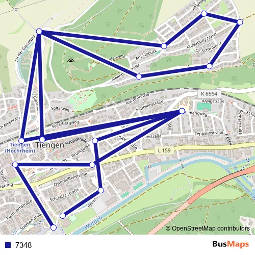 The first stop of the 7348 bus route is Waldshut-Tiengen, Stadthalle and the last stop is Tiengen (WT), Schulzentrum. 7348 is operational during an Werktagen.