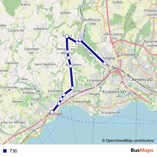 The first stop of the 736 bus route is Morges, gare and the last stop is Bussigny, gare sud. 736 is operational during an Werktagen.