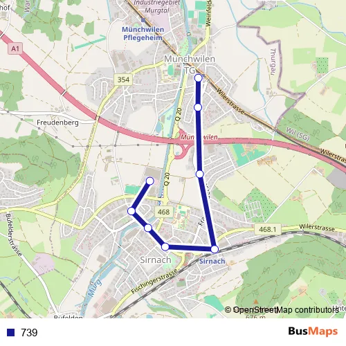 The first stop of the 739 bus route is Sirnach, Ebnet and the last stop is Münchwilen TG, Bahnhof Süd. 739 is operational during täglich.