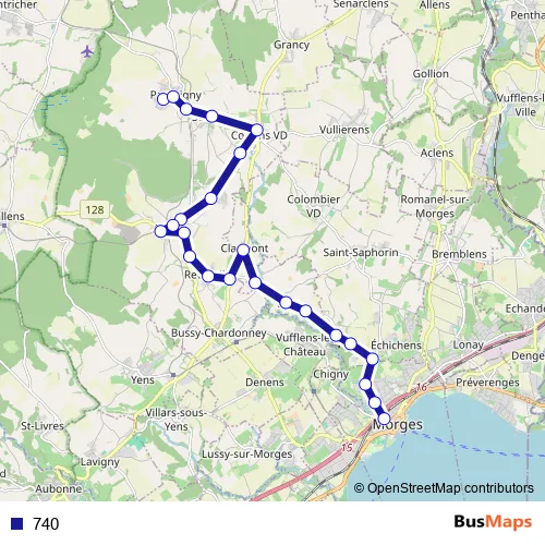 The first stop of the 740 bus route is Pampigny, collège and the last stop is Morges, gare. 740 is operational during täglich.